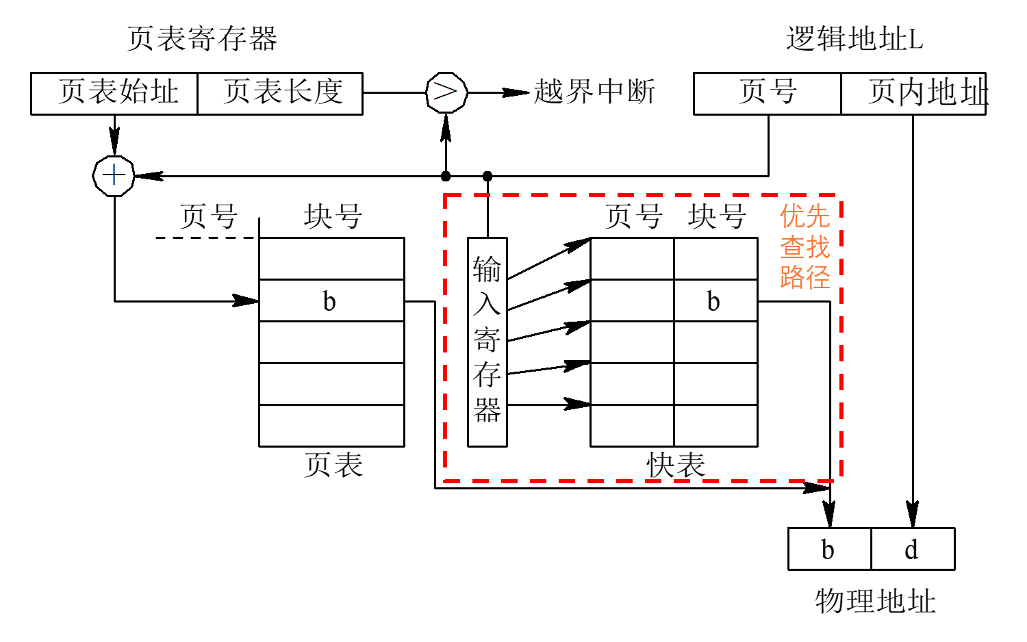 - 块表:具有并行查找能力的高速缓冲寄存器,又称为“联想寄存器”。存放当前访问过的哪些页表项。